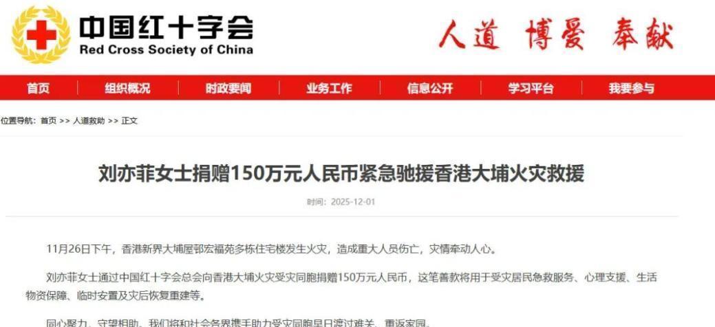 无祈福长文,无捐款凭证,更无跟风式加油口号。以她的国民影响力,这份缄默极易被曲解为冷漠。网络舆论本就急躁,两日沉寂后,质疑声四起:“她怎不发声?”“难道没捐钱?”质疑攒多了,便成了舆论风暴,可她依旧缄口。 12月1日红十字会公示名单揭开真相:捐款潮初起时,她已悄然捐出150万,未告知任何人事。有人赞其低调,却难概括这份坦荡。这更该是深入骨髓的修养。 娱乐圈的捐款向来棘手:捐少挨骂,捐多被指作秀,不捐遭斥无德;捐后不晒证被疑态度,晒证又被指公关。明星们早已摸熟“安全流程”:发博配证加祈福,交粉丝打理评论区,便可避责。但刘亦菲偏要打破这套。