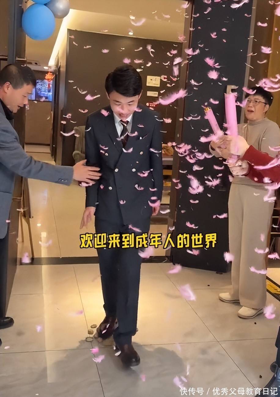 他回家的当天,家里人给他带来了一场惊喜的成人礼。只见他穿着整齐的双排扣小西装,刚进门,大家就立马用彩色羽毛迎接他。